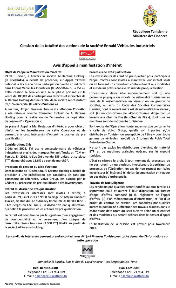 Appel à manifestation d'intérêt : Cession des actions de la société Ennakl Véhicules Industriels